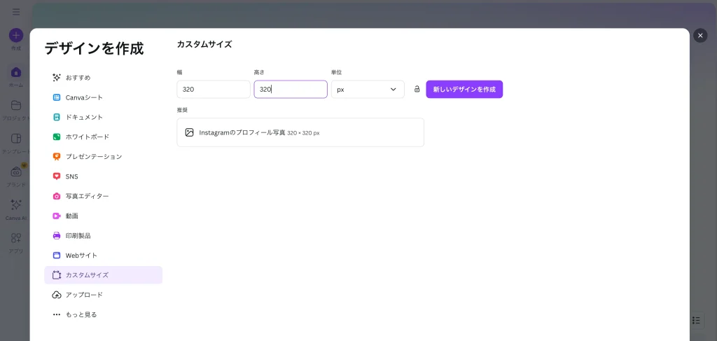 左上の + ボタンをクリックして、デザインを作成ページへ