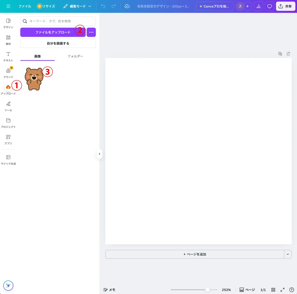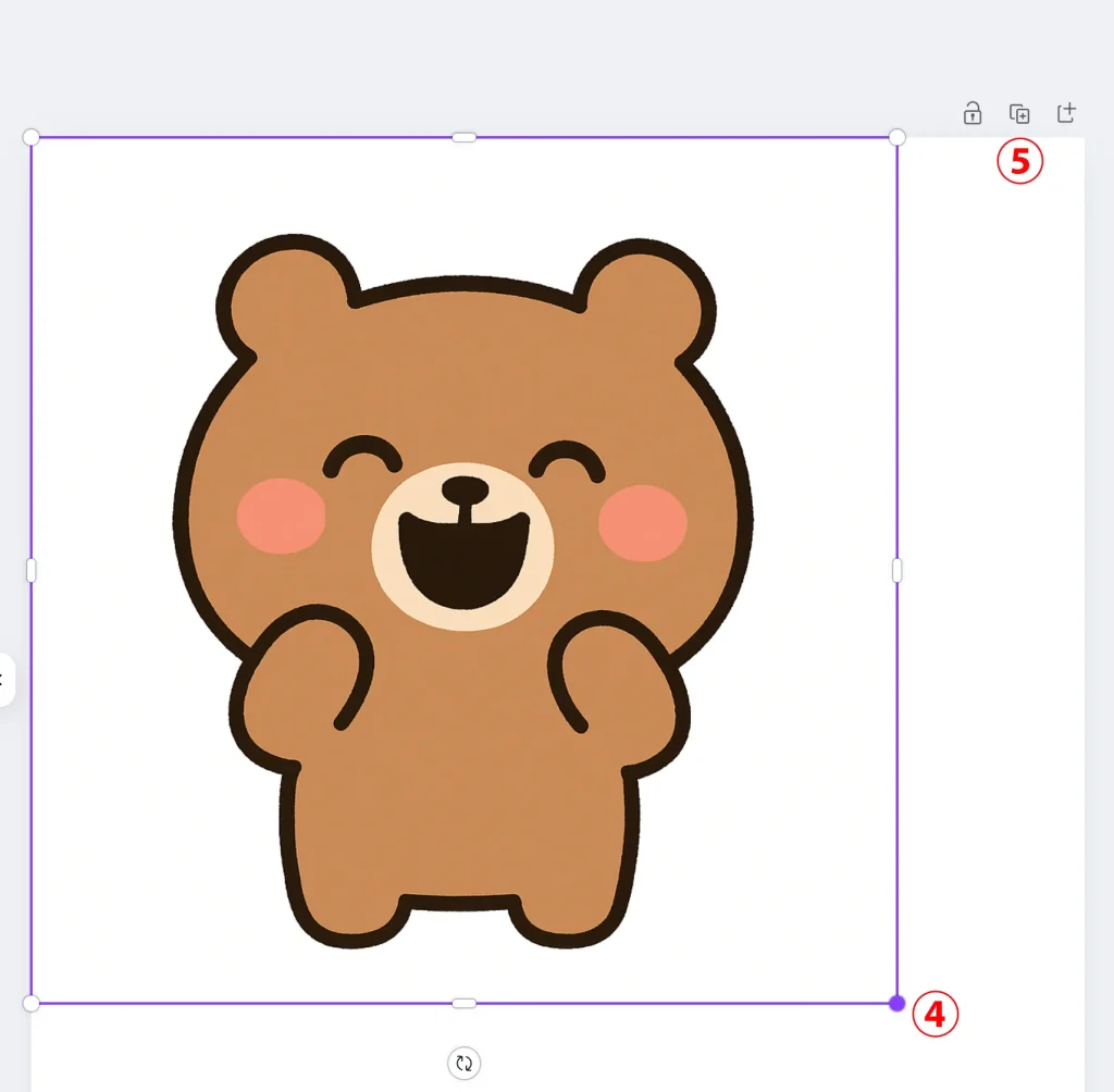 ④画像を選択して、キャンバスに配置。画像の四隅の四角丸(④)でサイズ調整が可能です。